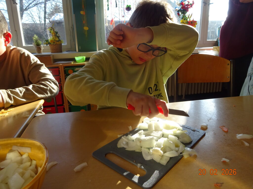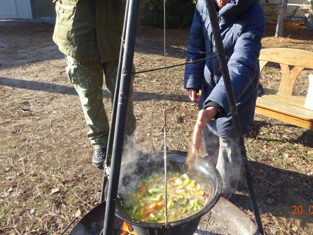 Den Abschluss der Ferien bildete ein gemeinsames Kochen. Wer wollte, brachte ein Gemüse seiner Wahl mit, und dann wurde gemeinsam geschnippelt. Dabei entstand große Wertschätzung für die tägliche Arbeit in den Familien, denn Kochen ist oft mit viel Aufwand verbunden. Anschließend wurde alles in einem großen Kessel über der Feuerschale zu einer leckeren Suppe gekocht. Am Ende blieb nichts übrig – alles wurde aufgegessen. Lecker!